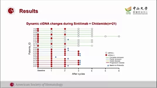 结外NK/T细胞淋巴瘤(ENKTL)是一种高度侵袭性的非霍奇金淋巴瘤(NHL),2020年ASH会议上黄慧强教授团队首次口头报道了SCENT研究结果(摘要号644),证实信迪利单抗(PD-1抗体)联合西达本胺(组蛋白乙酰化酶抑制剂)在复发或难治ENKTL患者中明显提高了治疗效果。基于SCENT研究的结果,该团队开始在初治ENKTL中探究非化疗方案“信迪利单抗联合西达本胺(SC)”作为初治患者一线治疗的疗效和安全性;研究同时嵌入NGS检测,对患者血浆ctDNA进行动态监测,探究ENKTL的突变图谱,治疗疗效相关的生物标志物及ctDNA检测在治疗中的潜在临床作用。