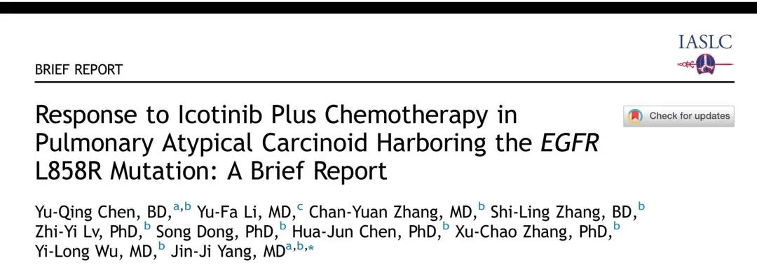 Chen Y Q, Li Y F, Zhang C Y, et al. Response to Icotinib Plus Chemotherapy in Pulmonary Atypical Carcinoid Harboring the EGFRL858R Mutation: A Brief Report[J]. JTO Clinical and Research Reports, 2021.