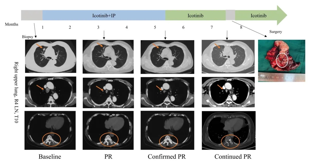 为确定更有效的治疗方案,使用NGS技术(37000vip威尼斯196 Panel)对活检组织进行基因检测,发现EGFR L858R突变(AF为31.37%),并伴有TP53突变、KRAS扩增和RB1缺失(图2)。基于基因检测结果,患者接受埃克替尼联合4个周期伊立替康/顺铂(IP)化疗,第2个月时达到部分缓解(PR),4个月时确认PR,且血清癌胚抗原(CEA)水平显著下降,后续使用埃克替尼继续治疗(图3)。5个月后,患者持续PR,PET-CT提示右上肺病灶F-18代谢未见异常,但R4淋巴结等病灶F-18高代谢,为病理确诊及更好地控制疾病,患者行右上肺叶前段和纵隔淋巴结的楔形切除术。