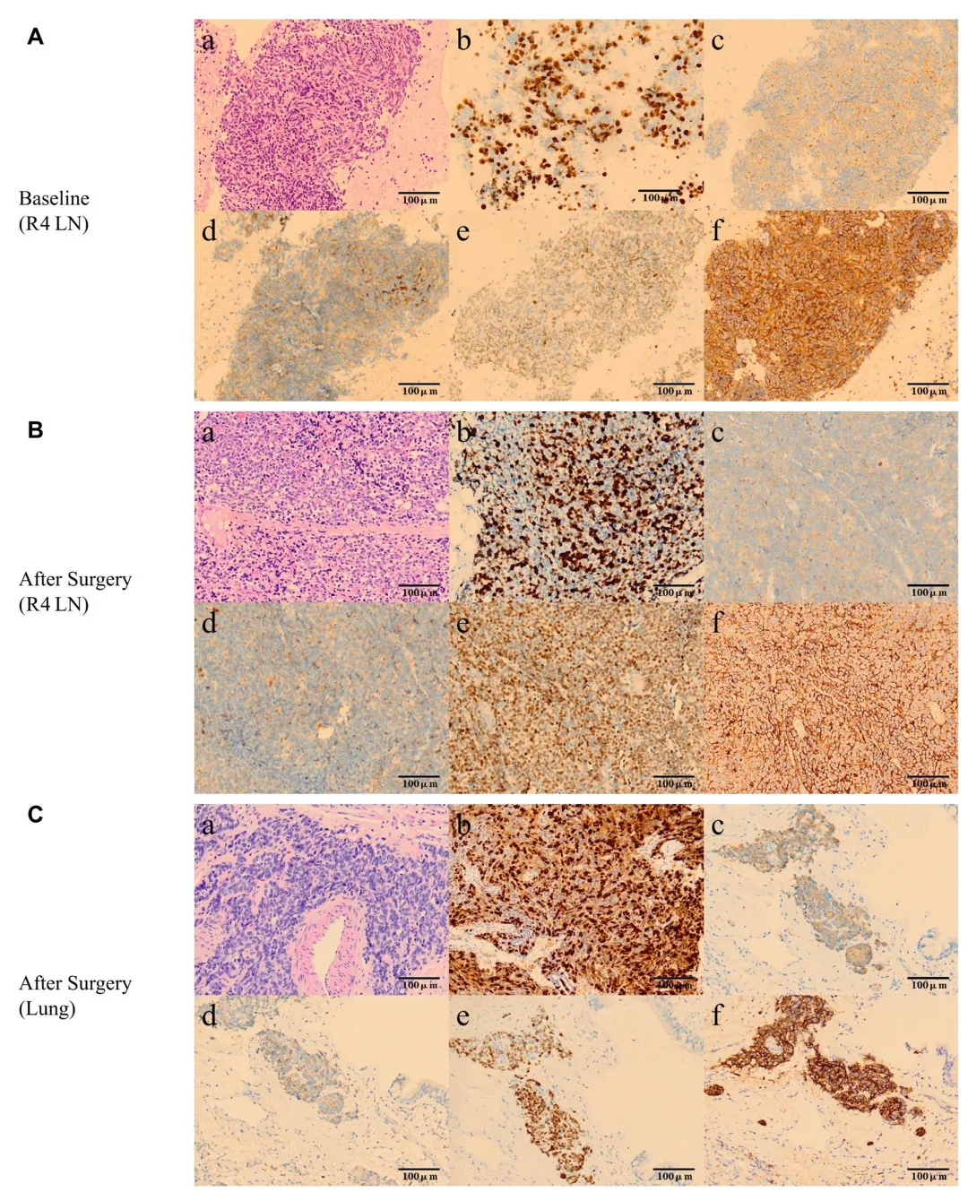 男,72岁,重度吸烟患者,无发烧、咳嗽、胸痛和其他任何症状。胸腹部CT检查时,显示右上肺有一个21mm病变,并伴有多个纵隔淋巴结转移,以及第十胸椎体和左椎弓骨破坏。支气管超声引导下(EBUS-TBNA)对R4淋巴结进行活检,提示为肺AC(图1A)。