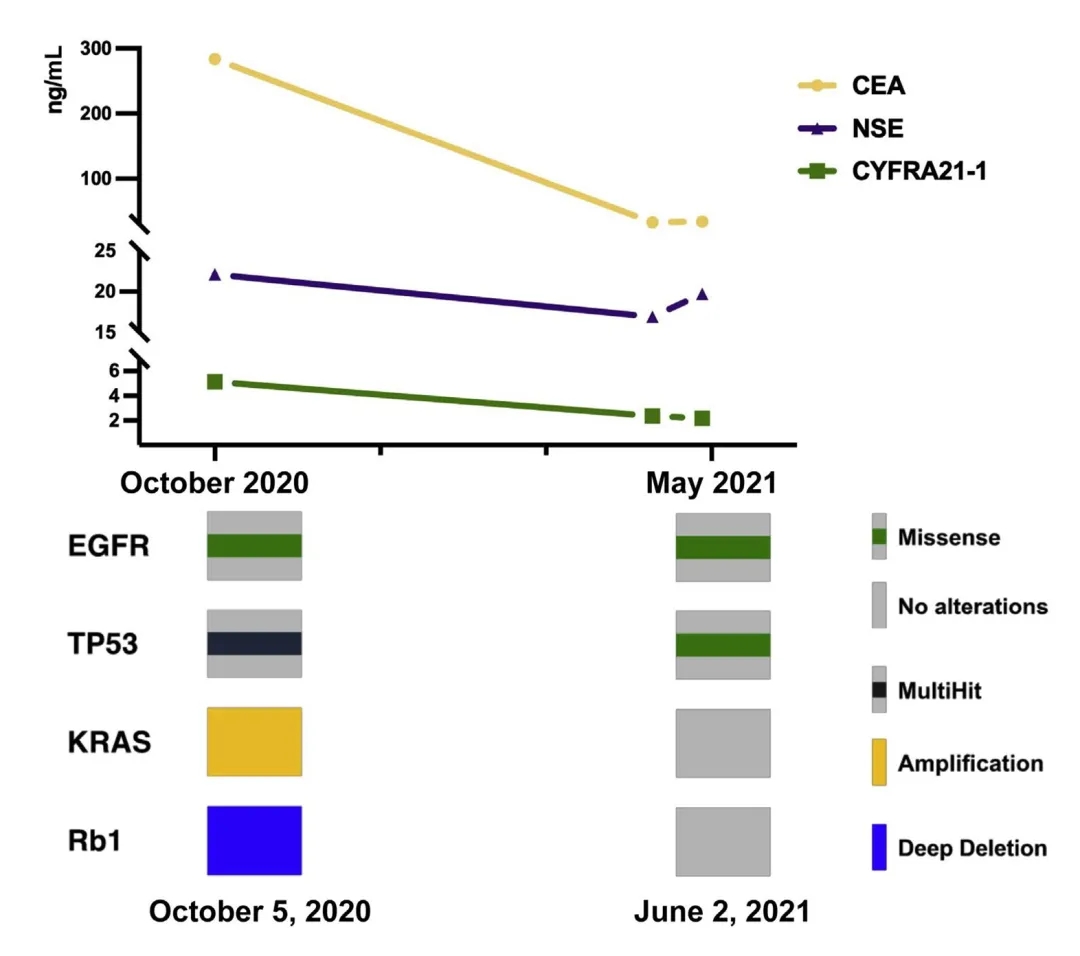 有趣的是,患者术后病理诊断为SCLC(图1B/C)。NGS检测结果显示患者仍携带EGFR L858R突变(AF较基线组织下降至13.30%),且KRAS扩增和RB1缺失均已消失(图2),患者继续采用埃克替尼进行治疗,并进行随访。